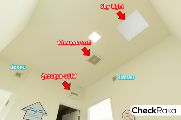 ที่ชั้นนี้จะติดตั้งตู้เบรกเกอร์ และกริ่งบนกำแพงหน้าห้องน้ำ ส่วนฝ้าเพดานที่เห็นจะมี Sky Light เพิ่มความสว่างให้พื้นที่