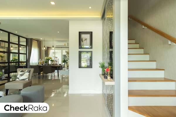 เข้ามาในบ้านจะเจอบันไดทางขึ้นชั้น 2 อยู่ขวามือค่ะ ส่วนฝั่งซ้ายมือคือพื้นที่พักผ่อนรับแขก