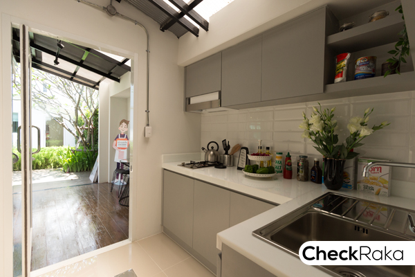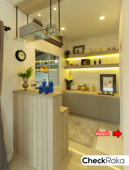 พื้นที่ครัว บ้านตัวอย่างตกแต่งเป็น Pantry สำหรับเตรียมอาหาร มีตู้และชั้นวางของ