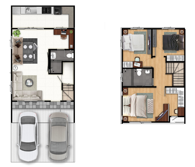 แปลนบ้านทั้งสองชั้นของแบบ 2 ที่จอดรถ
