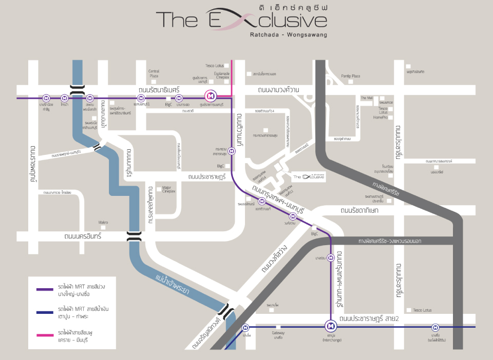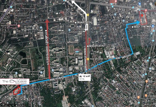 - ตรงไปตามทางบังคับระยะทางประมาณ 900 เมตร จะพบโครงการ "The Exclusive รัชดา-วงศ์สว่าง" อยู่ริมถนนซ้ายมือ