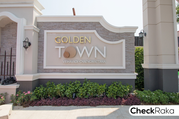 ฝั่งขวามือของซุ้มประตูทางเข้าโครงการ มีป้ายชื่อโครงการ Golden Town Vibhavadi - Chaengwattana