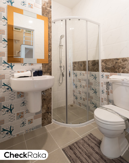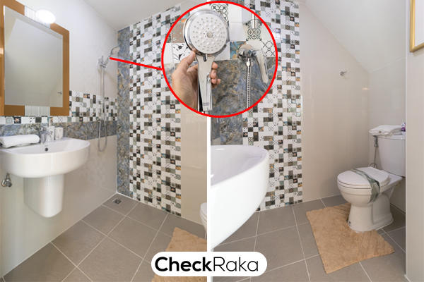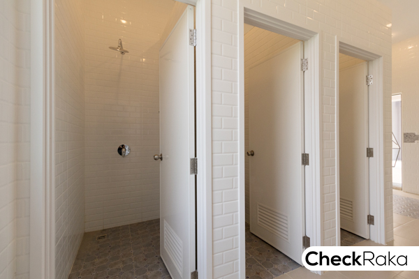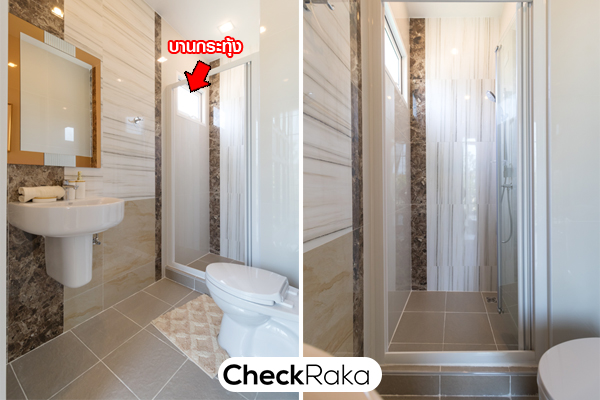 ด้วยประตูบานพับ ติดตั้งฝักบัวมาให้ เดินสายไฟไว้สำหรับ ติดตั้งเครื่องทำน้ำอุ่น และบ้านแปลงมุมมีบานกระทุ้ง