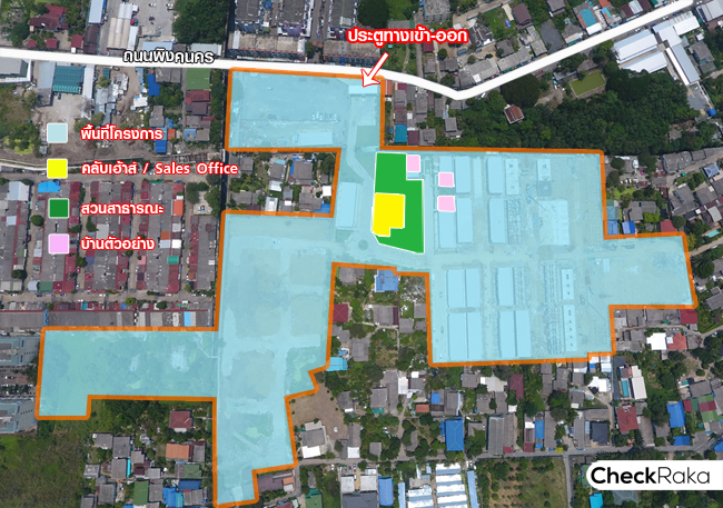 แสดงให้เห็นถึงขอบเขตโครงการโดยรวม สวนส่วนกลาง คลับเฮ้าส์ บ้านตัวอย่าง และทางเข้า-ออก