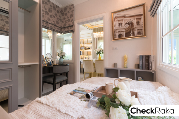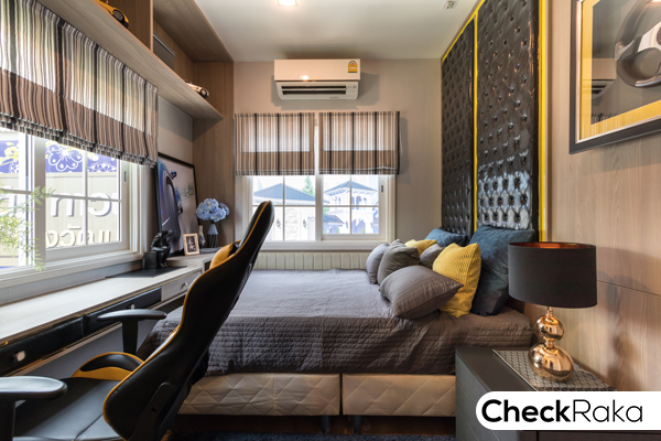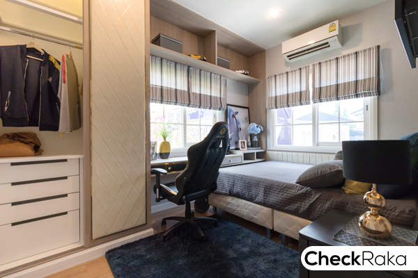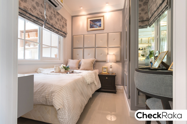 ภายในห้องสามารถตกแต่งเป็นห้องนอนได้นะคะ วางเตียงขนาดเล็ก โต๊ะเครื่องแป้ง และตู้ได้พอดี