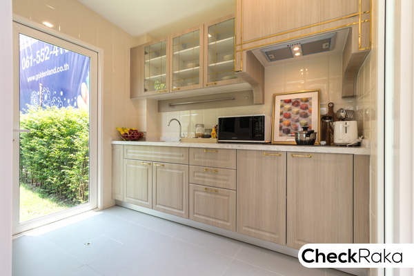 กั้นเป็นครัวปิดไว้ส่วนหนึ่ง อีกส่วนติดตั้งประตูเป็นไอเดียให้ดูเป็นตัวอย่าง