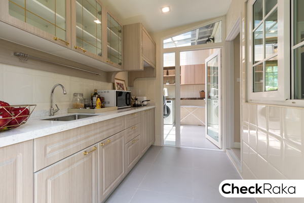 ลานซักล้างหลังบ้าน ทางโครงการตกแต่งให้เป็นครัวไทยแยกส่วน ติดตั้งเคาน์เตอร์ครัว และมุงหลังคา