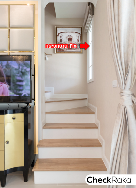 บันไดทางขึ้นชั้น 2 อยู่ด้านหน้าสุด จะมีกระจกบาน fix สำหรับรับแสงธรรมชาติให้ 1 บาน