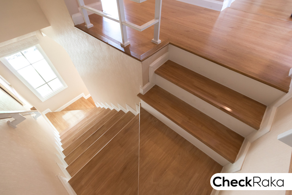 มีชานพัก แบบสามเหลี่ยม 2 จุด มีราวจับให้ 1 ข้าง พื้นบันไดและราวจับไม้ประสานสำเร็จรูป