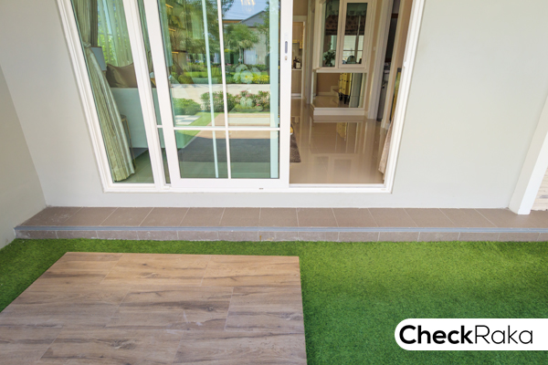เฉลียงหน้าบ้านยกสเต็ปให้ 1 ขั้น สูงขึ้นมาจากพื้นที่จอดรถเล็กน้อย ปูด้วยกระเบื้องเซรามิค