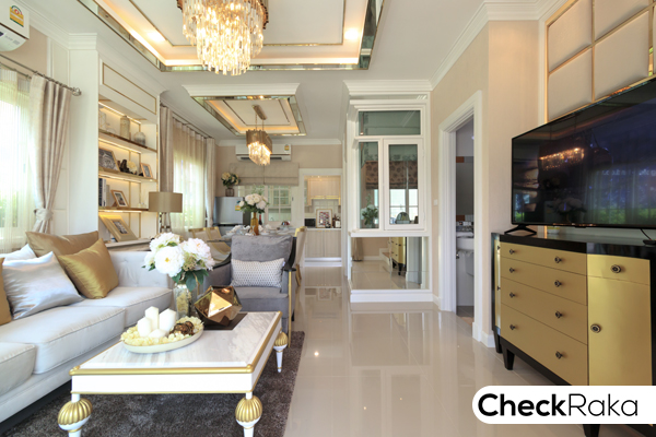 ข้างในตัวบ้าน ส่วนแรกตกแต่งเป็นโซนพักผ่อนไว้ต้อนรับแขก พื้นชั้นล่างปูด้วยกระเบื้องแกรนิตโต้ 60 x 60 ซม.