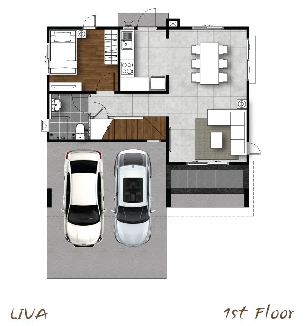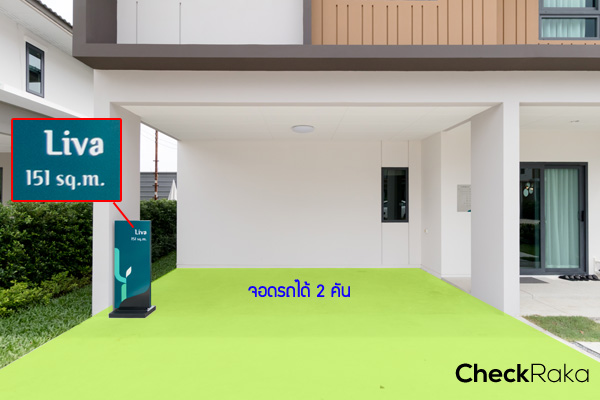 1. แบบบ้าน Liva เนื้อที่บ้านเริ่มต้น 50 ตร.ว. พื้นที่ใช้สอย 151 ตร.ม. ประกอบไปด้วย 4 ห้องนอน 3 ห้องน้ำ 2 ที่จอดรถ