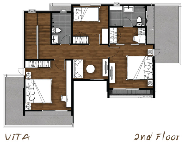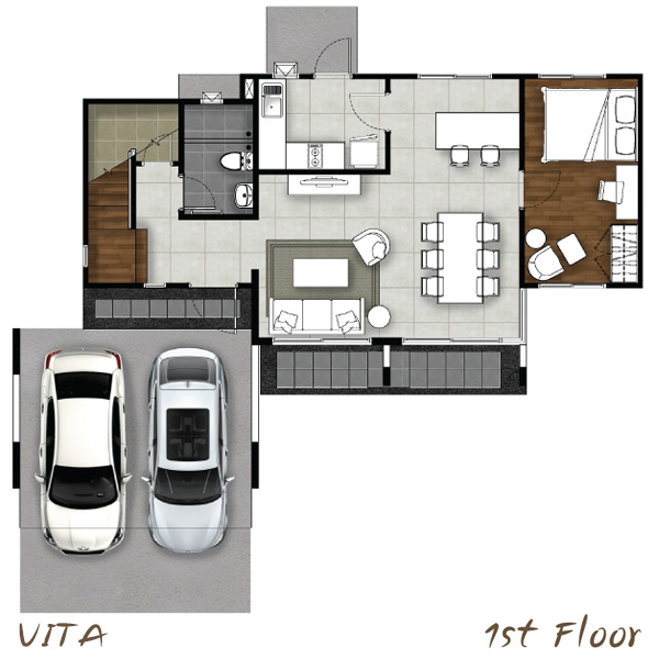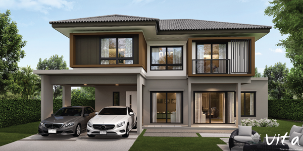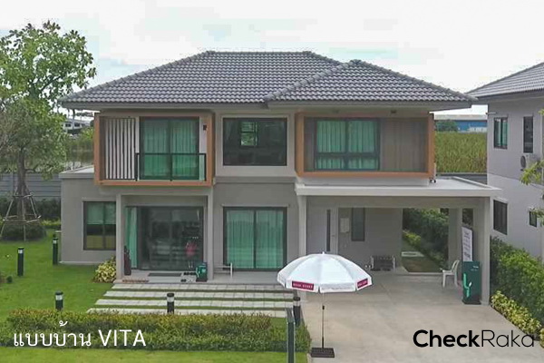 2. แบบบ้าน Vita เนื้อที่บ้านเริ่มต้น 59.60 ตร.ว. พื้นที่ใช้สอย 182 ตร.ม. ประกอบไปด้วย 4 ห้องนอน 3 ห้องน้ำ 2 ที่จอดรถ