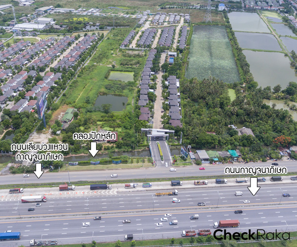 ตัวโครงการติดหน้าถนนเลียบวงแหวนกาญจนาภิเษก ฝั่งตะวันออก ตรงเข้าไปเป็นสะพานข้ามคลองปักหลักค่ะ