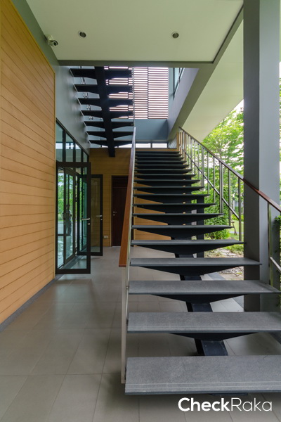 บันไดสำเร็จรูป คอนกรีตเสริมเหล็ก ชานพักกว้างขวาง และมีบานหน้าต่างรับแสงได้ดี
