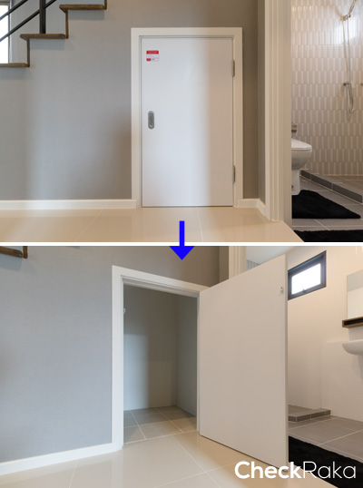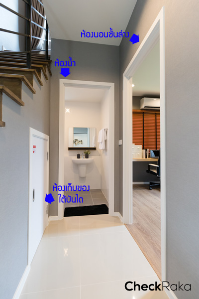 ซ้ายมือเป็นห้องเก็บของใต้บันได ด้านหน้าเป็นห้องน้ำ และห้องนอนชั้นล่างอยู่ขวามือ