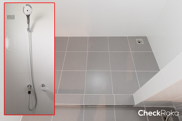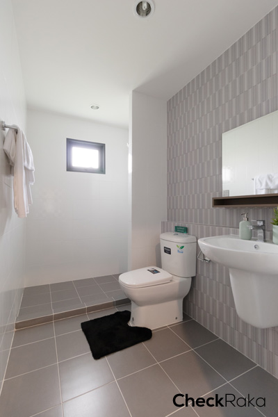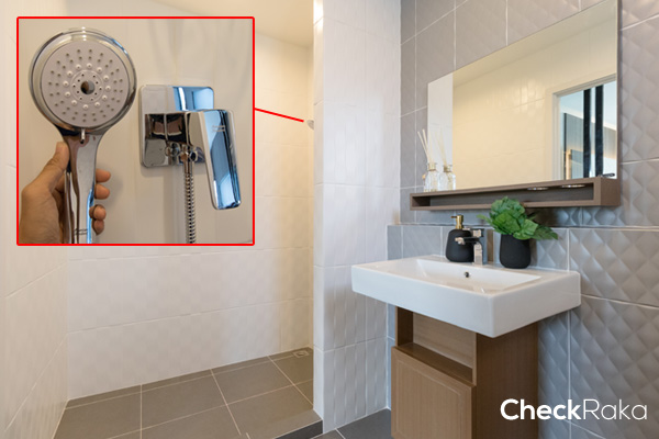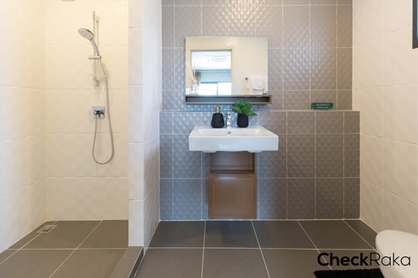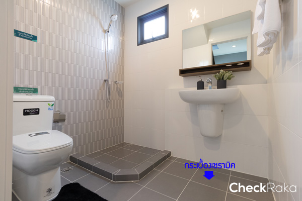 ห้องน้ำพื้นกระเบื้องเซรามิค มีพื้นที่ส่วนเปียกกั้นด้วยขอบพื้นยกสูง
