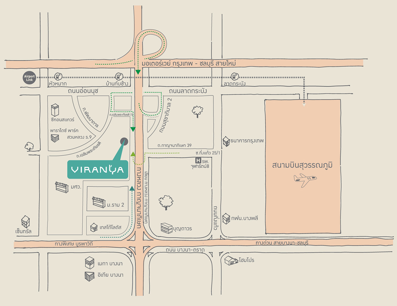 วิรัณยา วงแหวน - อ่อนนุช" อยู่ติดกับถนนเลียบวงแหวนกาญจนาภิเษก ซึ่งเป็นถนนใหญ่สายหลักในการเดินทางของกรุงเทพฯ สภาพแวดล้อมโดยรอบโครงการส่วนใหญ่มีหมู่บ้านจัดสรรค่อนข้างเยอะ และยังมีพื้นที่ดินเปล่าอยู่บ้าง ในอนาคตอาจจะมีการพัฒนาพื้นที่ดินที่ว่างเปล่านี้ ให้มีสิ่งอำนวยความสะดวกเยอะยิ่งขึ้น สำหรับร้านค้า ร้านอาหารส่วนใหญ่ มีกระจัดกระจายอยู่รอบๆ โครงการ หาไม่ยาก ถือว่าค่อนข้างสะดวกค่ะ