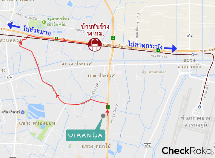 การเดินทางจากโครงการไปยังรถไฟฟ้า Airport Link สถานีบ้านทับช้าง โดยรถยนต์ ใช้เส้นทางถนนพัฒนาการ