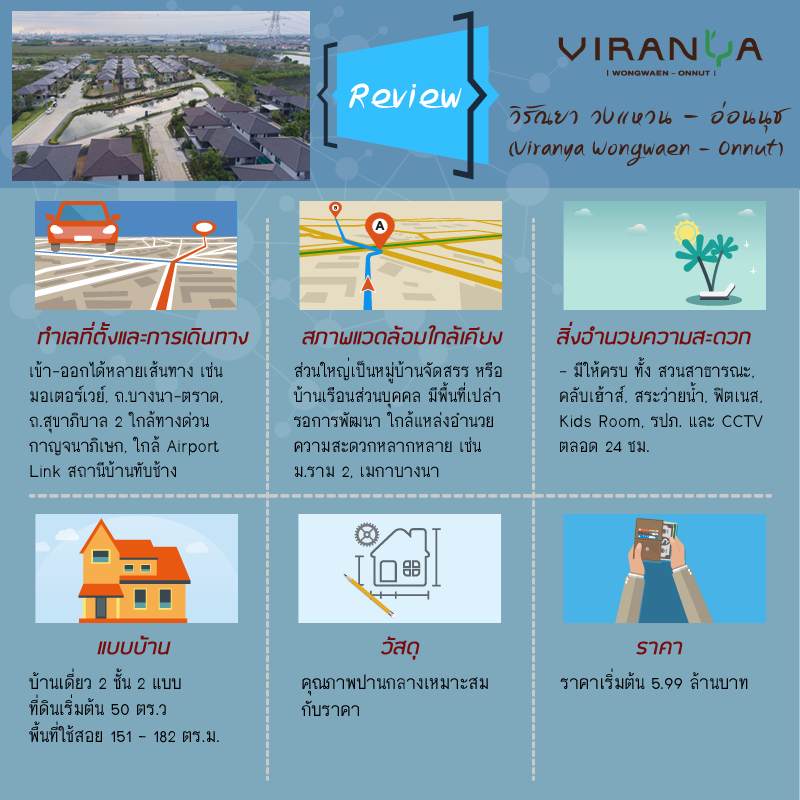 วิรัณยา วงแหวน - อ่อนนุช (Viranya Wongwaen - Onnut) มีทั้งหมด 3 เฟส ปัจจุบันอยู่ในระหว่างการขายของเฟสที่ 1 ซึ่งเหลืออีกนิดหน่อย และเพิ่งเริ่มเปิดขายเฟส 2 ไปเมื่อไม่นานมานี้ โดยเฟส 2 มีแบบบ้าน 2 แบบ คือ Liva และ Vita ซึ่งเป็นแบบบ้านใหม่ อยู่ในโซนตั้งแต่ทะเลสาบเป็นต้นไป *