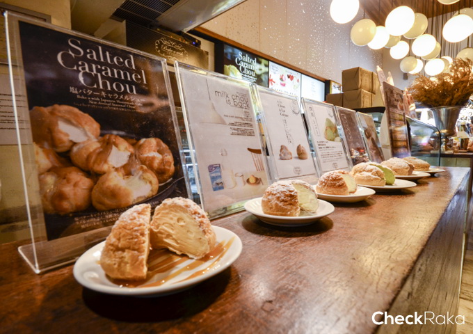 ตัวอย่างขนมวางตั้งให้ดูถึงความน่ากิน อันนี้เป็นชูครีมหลากหลายไส้ ชิ้นใหญ่มาก