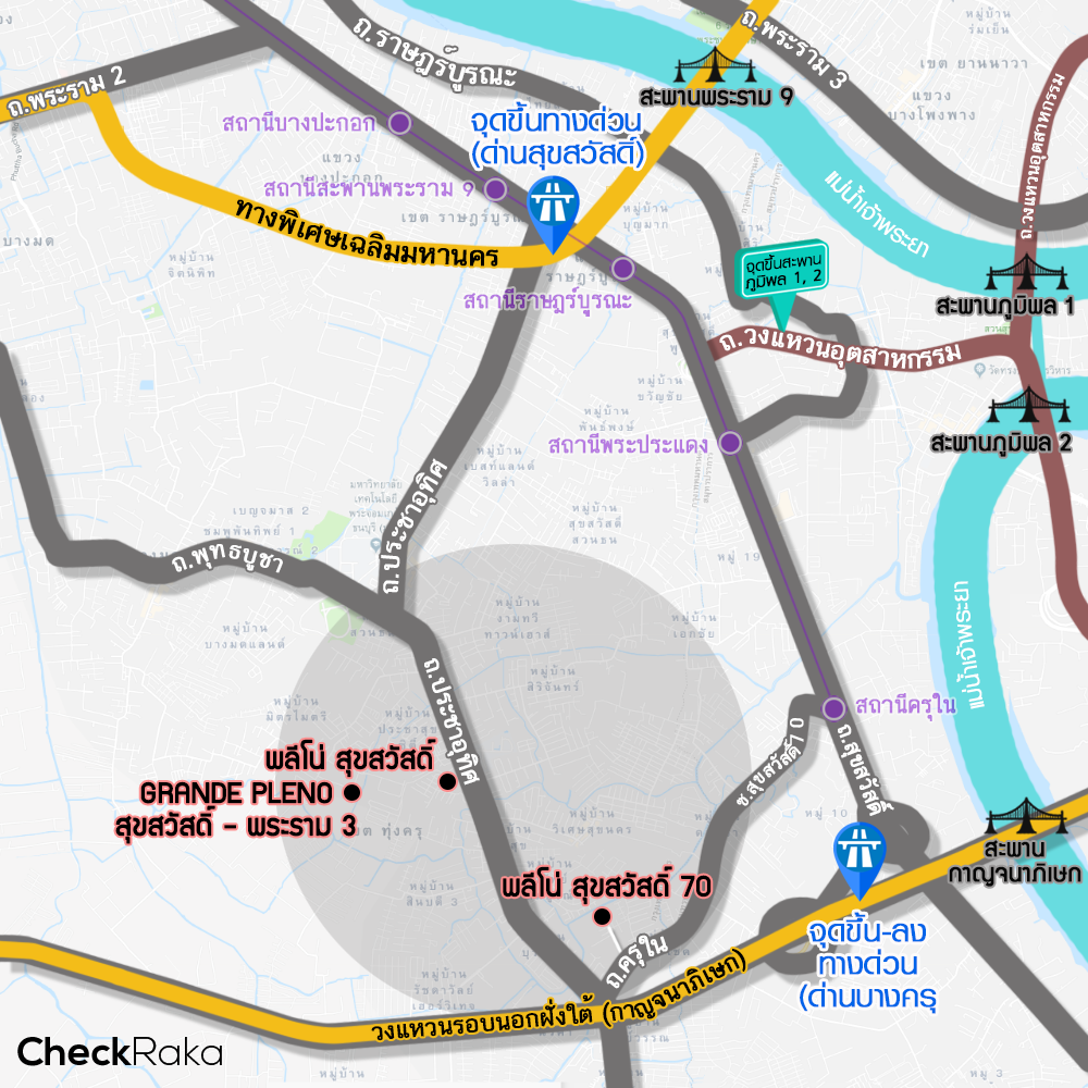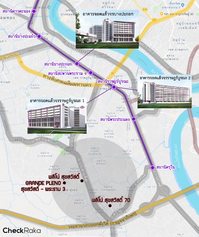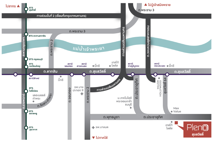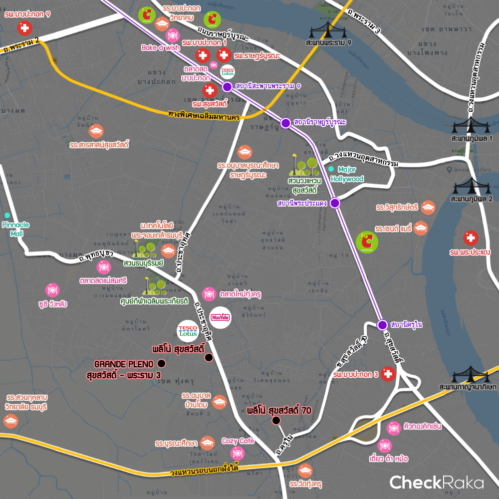 แผนที่โครงการพลีโน่ 3 โครงการ บนทำเลสุขสวัสดิ์ และสถานที่สำคัญโดยรอบ (