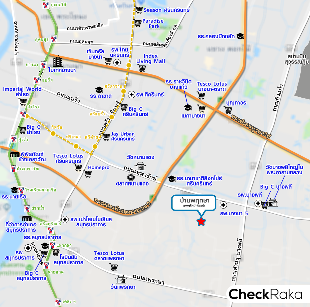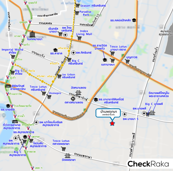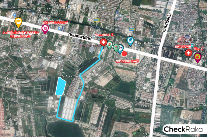 - ที่ตั้งโครงการ : ถนนเทพารักษ์ (ซอยกรุงสยามวิลล่า) ตำบลบางพลีใหญ่ อำเภอบางพลี จังหวัดสมุทรปราการ 10540