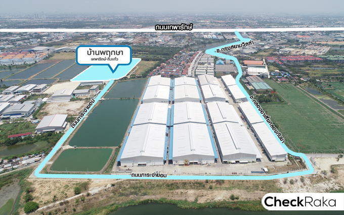 ภาพจากมุมสูงของ บ้านพฤกษา เทพารักษ์ - กิ่งแก้ว แสดงให้เห็นขอบเขตของโครงการ