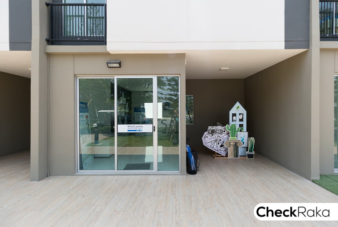 บ้านตัวอย่างอยู่ติดกับสำนักงานขาย เป็นทาวน์โฮมบล็อคเดียวกัน ออกแบบสไตล์สแกนดิเนเวีย สีโทนเข้ม