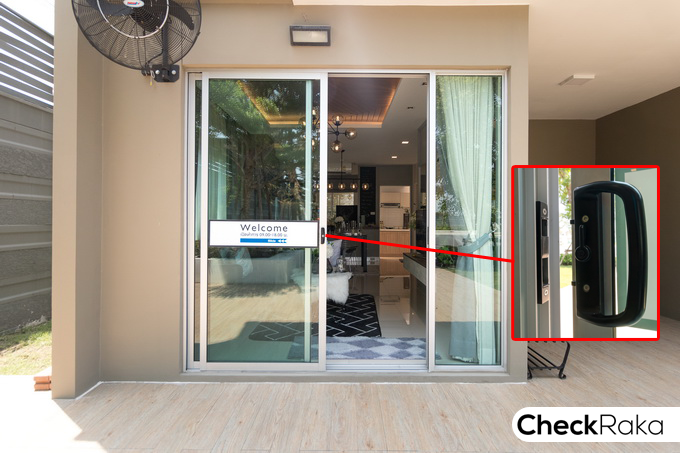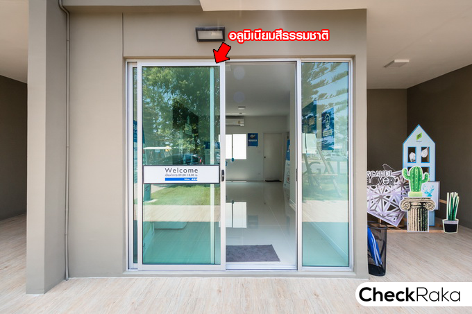 ประตูทางเข้าหลักเป็นประตูบานเลื่อนพร้อมตัวล็อค ข้างประตูฝั่งขวามือเป็นกระจกบาน Fix สำหรับบ้านเปล่ามาตรฐาน เฉลียงหน้าบ้านยกสเต็ปให้ 1 ขั้น สูงขึ้นมาเล็กน้อย