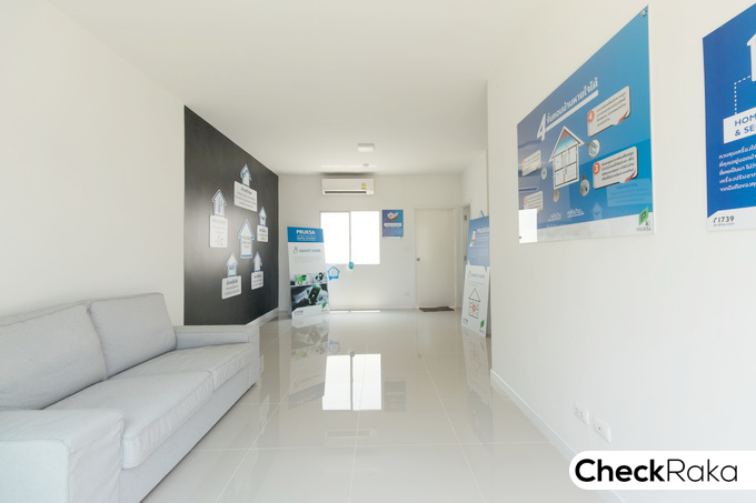 พื้นชั้นล่างปูด้วยกระเบื้องแกรนิตโต้ 60 x 60 ซม. ไฟด้านล่างเป็นโคมไฟ LED Downlight ฝ้าที่ให้เป็นฝ้าเรียบ สติ๊กเกอร์ที่เห็นติดตรงผนังเป็นคำอธิบายบ้านพฤกษา Fresh Air System เพื่อให้ทราบถึงข้อดี และการทำงานของระบบนี้