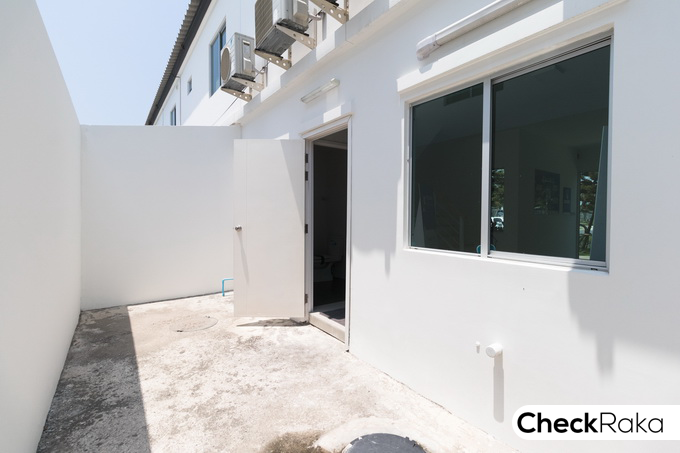 และไม่ได้จัดสวนให้ บ้านแต่ละหลังจะมีรั้วกั้นสูงประมาณ 1.30 เมตร ประตูหน้าบ้านเป็นประตูเหล็กบานพับสีดำ