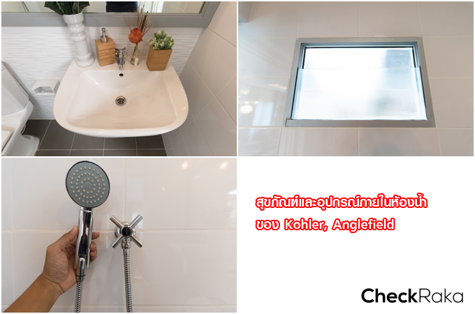 ห้องน้ำชั้นล่างมีครบทั้งโถสุขภัณฑ์ อ่างล้างมือ ก๊อกน้ำ และฝักบัวอาบน้ำ ไม่ได้แยกส่วนเปียก/แห้งให้ ของ Kohler/Anglefield ส่วนไฟเป็นไฟ LED Downlight