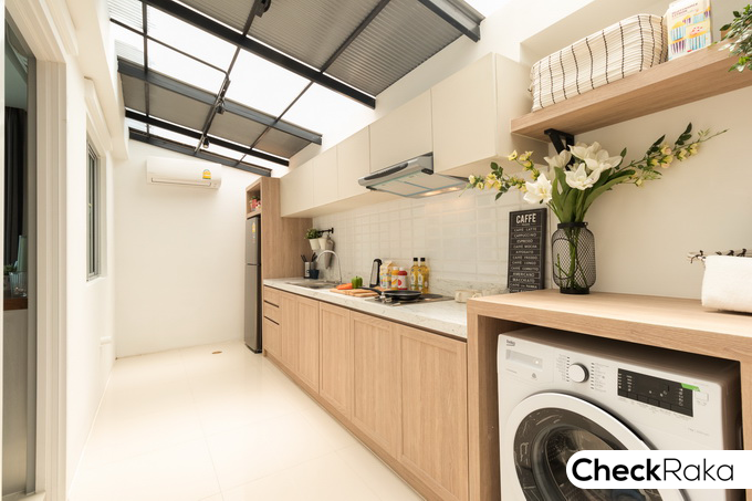 ลานซักล้างด้านหลังบ้านที่นี่เป็น Smart Kitchen สำหรับบ้านเปล่ามาตรฐานจะเทคอนกรีตเสริมเหล็กขัดหยาบลาดยาวให้เต็มพื้นที่ ทำระบบท่อน้ำดีน้ำทิ้งให้เรียบร้อย ลงเสาเข็มให้ลึกเท่าตัวบ้าน เพื่อรองรับการต่อเติมครัวไทยด้านหลัง