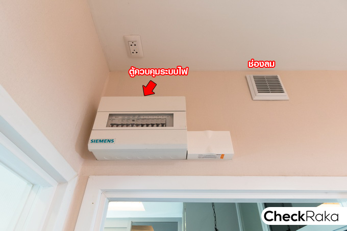 มีตู้ควบคุมระบบไฟและกริ่ง ติดตั้งบนกำแพงหน้าห้องนอนนี้ด้วย ส่วนช่องลมรับอากาศและระบายอากาศ