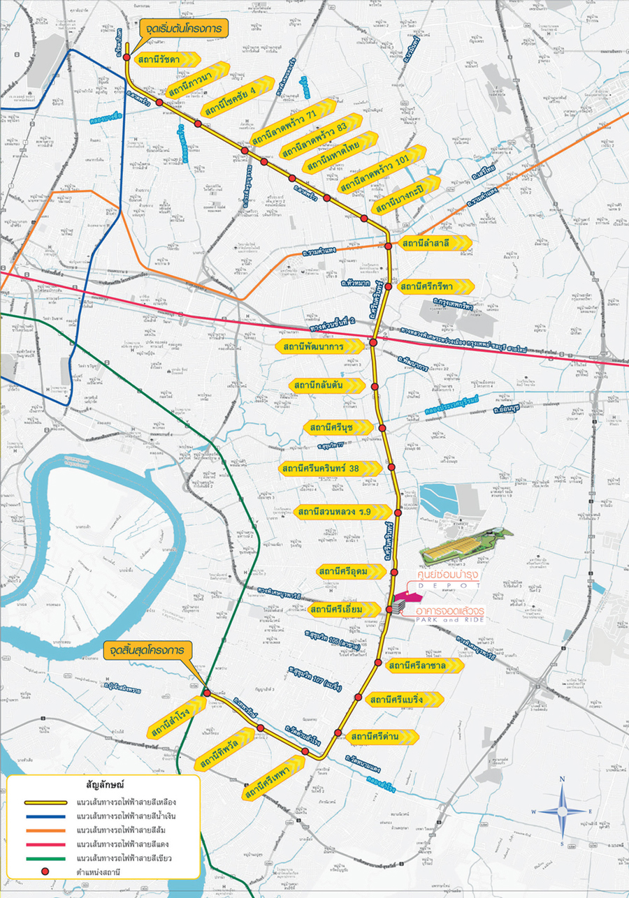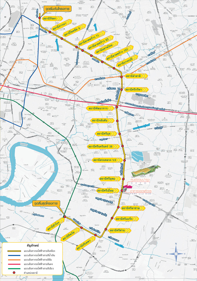 แผนที่เส้นทางรถไฟฟ้า สายสีเหลือง (ลาดพร้าว-สำโรง) ในอนาคต