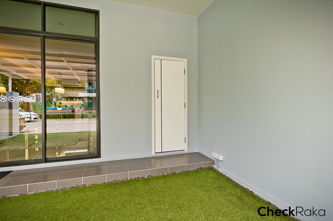 ด้านข้างประตูทางเข้าเป็นประตูห้องเก็บของ ส่วนเฉลียงหน้าบ้านจะยกสูงจากพื้นลานจอดรถขึ้นมา 1 สเต็ป