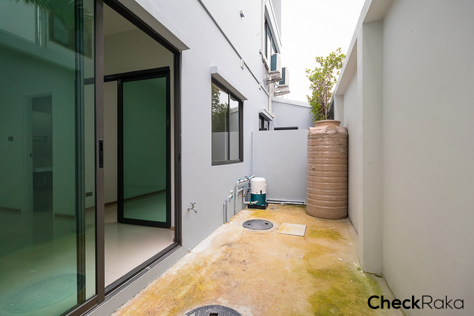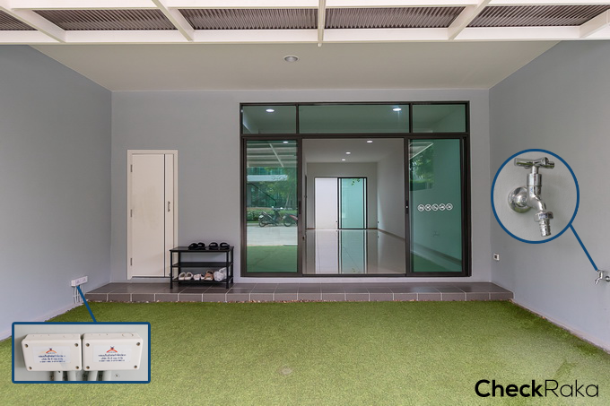 ออกจากห้องมาจะเป็นประตูเปิดออกไปลานซักล้างหลังบ้าน สำหรับบ้านตัวอย่างนี้ ทางโครงการตกแต่งให้เป็นครัวแยกส่วน ติดตั้งเคาน์เตอร์ครัว และมุงหลังคาไว้ให้ดูเป็นตัวอย่าง ซึ่งท่านเจ้าของบ้านสามารถปรับพื้นที่ส่วนนี้ได้ตามใจชอบ