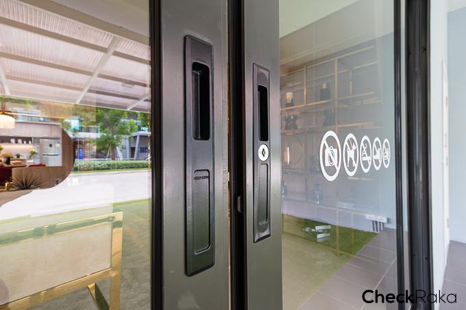ประตูทางเข้าหลักเป็นประตูบานเลื่อนคู่ กระจกเขียวตัดแสง กรอบประตูอะลูมิเนียม Powder Coat สีเทาดำ
