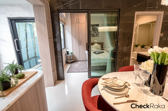 ถัดจากพื้นที่พักผ่อนรับแขก เป็นโต๊ะรับประทานอาหาร สามารถวางโต๊ะอาหารขนาด 4-6 ที่นั่งได้