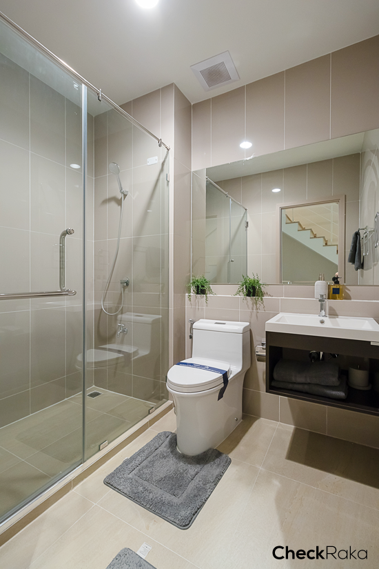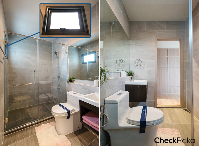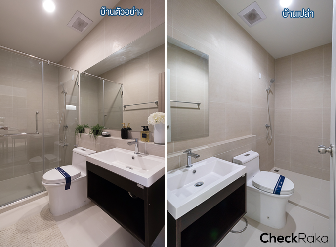 ภายในห้องน้ำให้สุขภัณฑ์มาครบเหมือนห้องที่ผ่านมา ทั้งโถสุขภัณฑ์ อ่างล้างมือ กระจก และฝักบัว ไม่ได้ติดตั้งพัดลมดูดอากาศมาให้เหมือนห้องน้ำห้องอื่น แต่มีบานกระทุ้งสำหรับเปิดระบายอากาศให้แทน บ้านเปล่าจะก่อธรณีกั้นแยกส่วนเปียก/แห้งให้ ไม่มีกระจกกั้นแบบบ้านตัวอย่าง