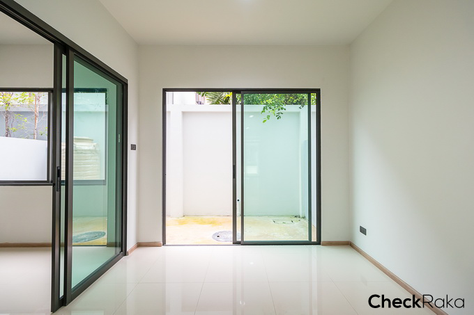 เปรียบเทียบกับบ้านเปล่ามาตรฐาน จะเห็นหน้าต่างบานเลื่อนขนาดใหญ่ 1 บาน และกระจกบาน Fix