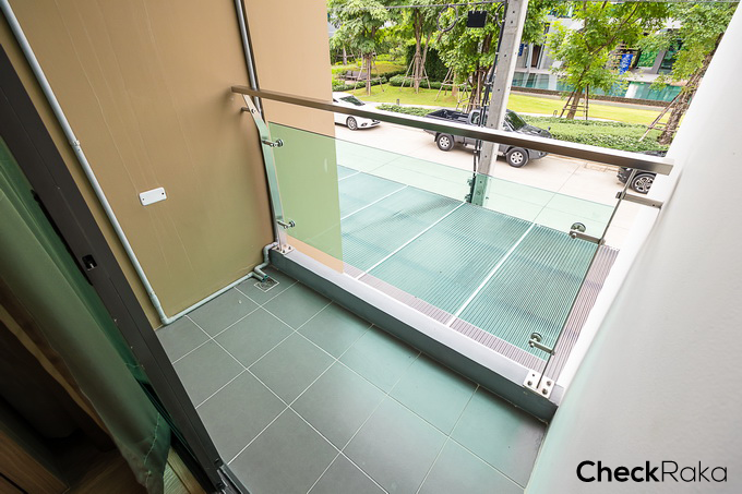 ระเบียงขนาดพอเหมาะ มีราวกันตกเป็น Tempered Glass หรือกระจกนิรภัย ซึ่งถือว่าใส่ใจทั้งความสวยงามและ