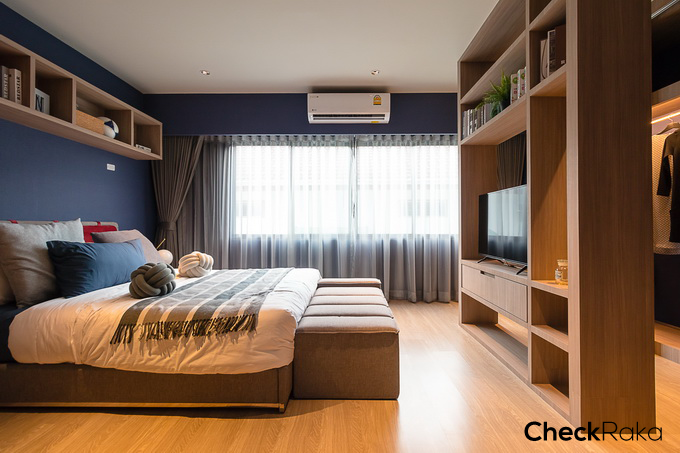 ปลายเตียงมีพื้นที่เหลืออยู่กว้าง สามารถ Built-in Partition วางทีวี หรือจะทำชั้นวางของก็ได้ ยังมีพื้นที่ให้เดินได้สบายๆ และยังสามารถวางตู้เสื้อผ้าที่ตรงสุดผนัง จัดเป็นมุม Walk in Closet ก็ได้เช่นกัน