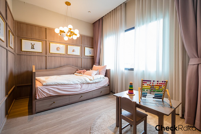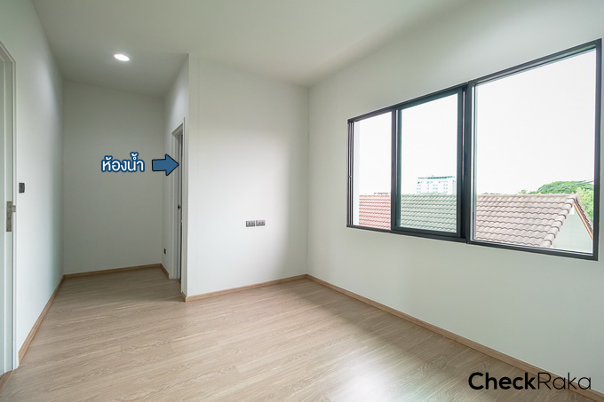 ห้องนอนห้องแรกของชั้นนี้ คือห้องนอน 2 วางตัวอยู่ด้านหลังบ้าน มีขนาดพอเหมาะ สามารถวางเตียงนอนขนาดเล็ก เหมาะสำหรับเป็นห้องนอนของคุณลูก และมีหน้าต่างบานเลื่อน และบาน Fix ให้