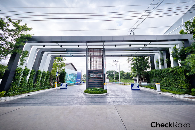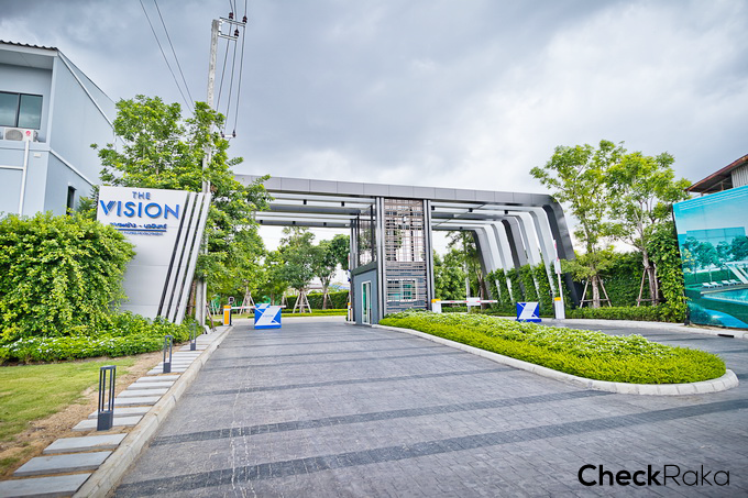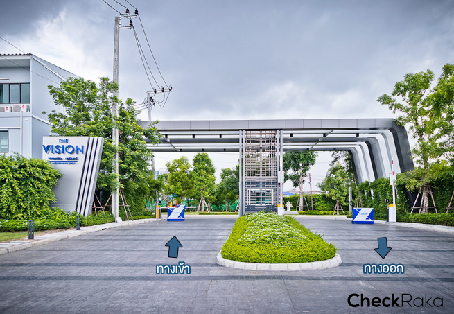 ซุ้มประตูโครงการสไตล์โมเดิร์น มีขนาดใหญ่ พร้อมชื่อโครงการ The Vision Ladprao - Nawamin อยู่ฝั่งซ้ายมือ