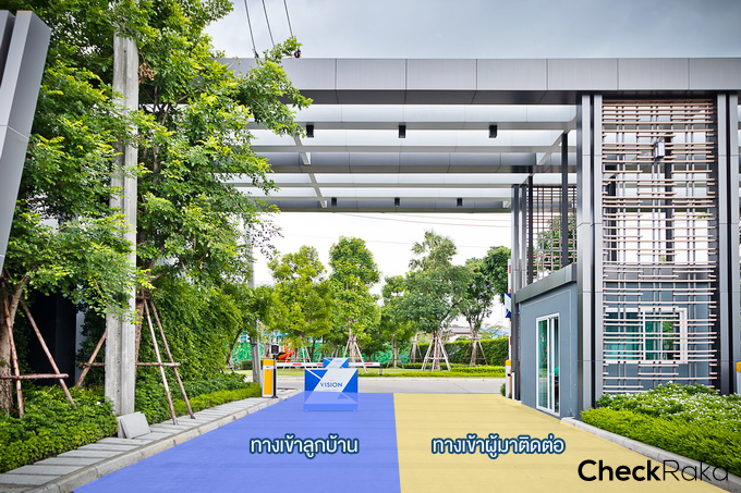 ประตูทางเข้าจะแยกระหว่างทางเข้าลูกบ้าน กับคนภายนอกที่มาติดต่อ ฝั่งลูกบ้าน (ฝั่งซ้าย) สแกนด้วยระบบ RFID ไม้กั้นก็จะเปิดอัตโนมัติเลย ไม่มีทางเดินเข้าสำหรับคนเดินเท้าให้ มี CCTV และมีห้องสำหรับ รปภ. กั้นตรงกลางระหว่างทางเข้าและทางออก ส่วนฝั่งขวามือสำหรับคนที่มาติดต่อก็สามารถจอดแลกบัตรที่ รปภ.ได้เลย