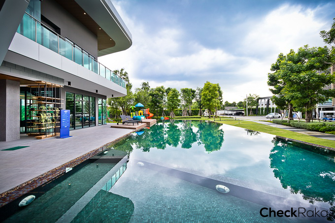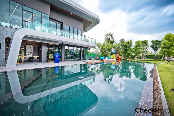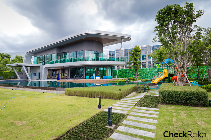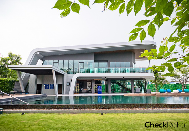 อาคารคลับเฮ้าส์ 2 ชั้น ขนาดใหญ่ สไตล์ Modern ล้อมรอบด้วยสวนสีเขียว