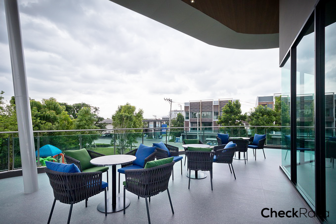 ส่วนระเบียงด้านนอกของชั้น 2 จะมีโต๊ะ เก้าอี้ นั่งพักผ่อนให้