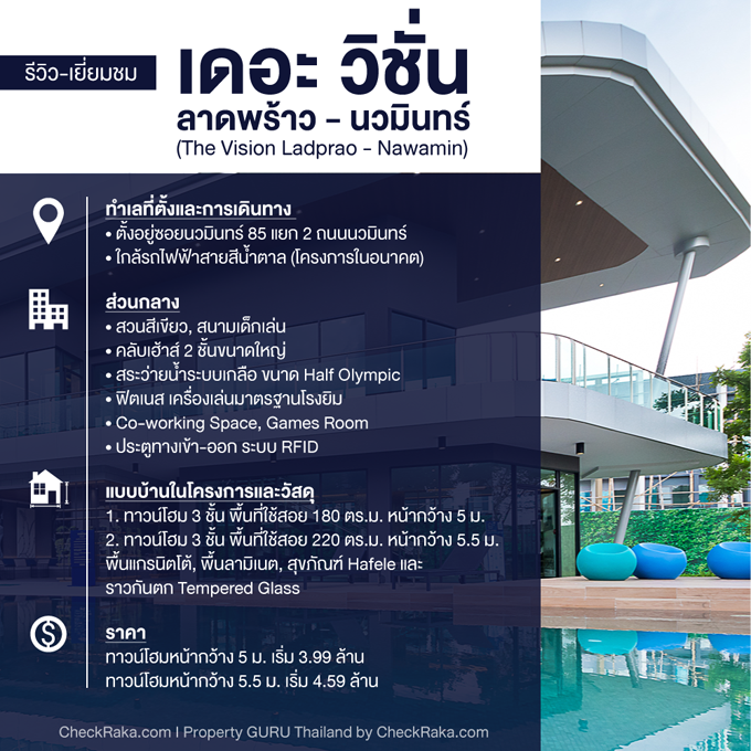 เดอะ วิชั่น ลาดพร้าว - นวมินทร์ (The Vision Ladprao - Nawamin) ทาวน์โฮมใหญ่เท่าบ้านเดี่ยว 220 ตร.ม. 3 ชั้น 5 ห้องนอน ที่จอดรถ 2 คัน ถนนหน้าบ้านกว้าง 12 เมตร พร้อมสโมสรขนาดใหญ่ สระว่ายน้ำ Half Olympic* ส่วนลดสูงสุด 750,000 บาท เริ่ม 3.59 ล้านบาท*
